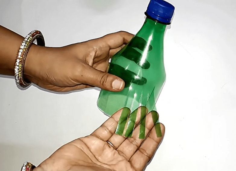 Для реализации идеи идеально подойдет бутылка из-под спрайта. Сначала ее необходимо разрезать на 2 части, а затем сделать разрезы вглубь так, чтобы получить узкие полоски.