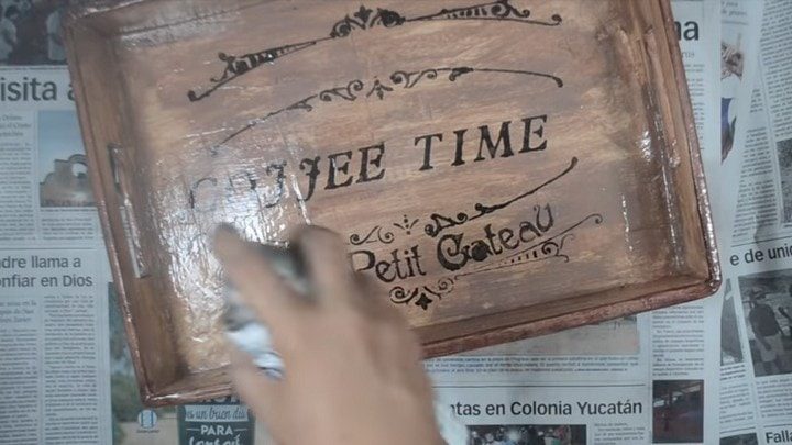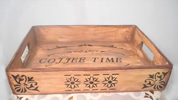 После того, как коричневая краска просохнет, начинаем украшать поднос. Проще всего для этого использовать трафарет. Закрепите его на дне с помощью бумажного скотча и пройдись по надписям краской чёрного цвета. Можно таким же образом украсьте и боковые стенки.