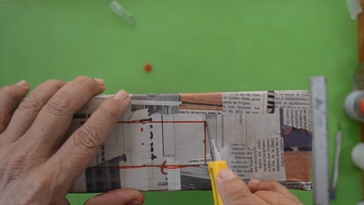 Покрыть будущий поднос двойным слоем газетных обрывков нужно полностью. На коротких боковых сторонах разметьте и вырежьте с помощью канцелярского ножа отверстия, чтобы поднос можно было держать. Эти срезы также нужно заклеить обрезками газет.