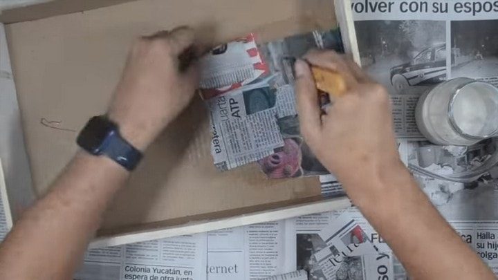 Следующий этап — оклеивание коробки кусочками газет при помощи разбавленного клея ПВА. Это придаст изделию ещё большую прочность и поможет лучше выровнять поверхность.