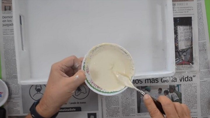 Теперь поднос необходимо покрыть слоем белого красителя. Далее смешиваем акриловые краски белого и ванильного цвета и снова тщательно покрываем всю поверхность.