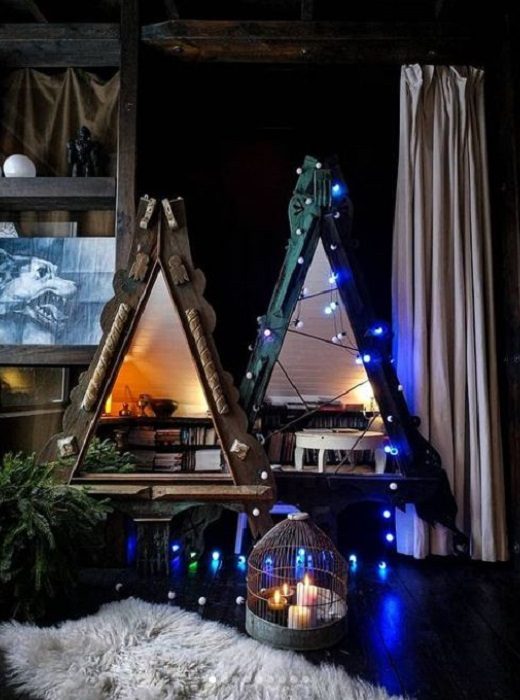 А еще Виталий делает из фрагментов наличников новогодние ёлки-зеркала. Тоже неплохой подарок. Наличники для «ёлок» он нашел в Удмуртии.