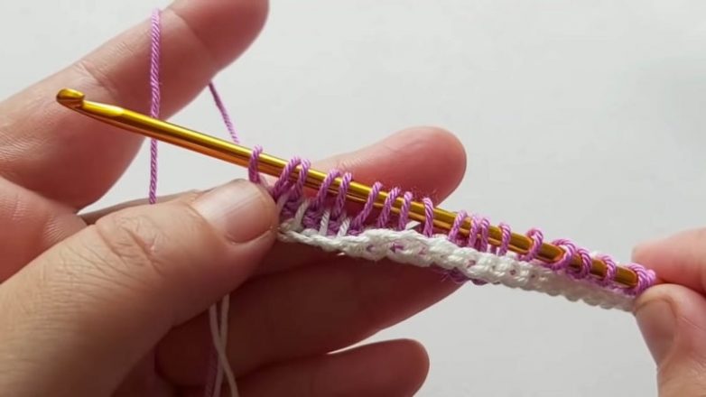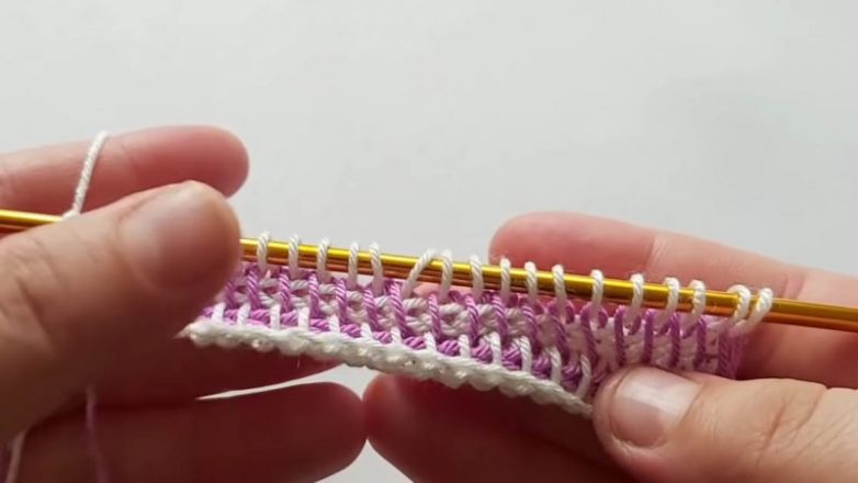 Далее будьте внимательны, так как это основная техника тунисского вязания. Захватите новую розовую пряжу, проденьте крючок одновременно через сделанную петлю и через следующую петлю белой пряжи. Таким образом, провяжите до конца ряда.