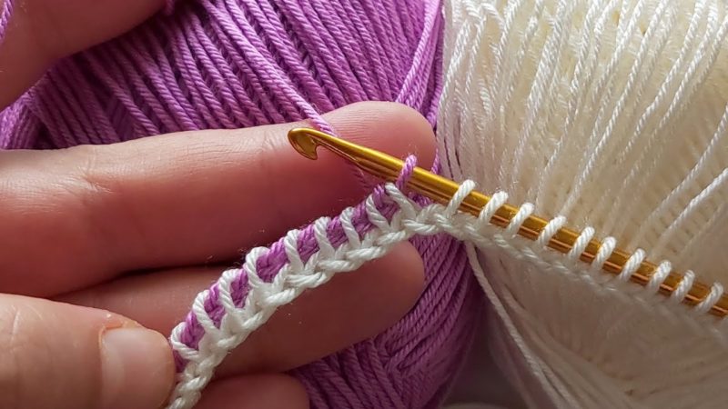 Затем сделайте то же самое, что и в начале с белой пряжей: наберите петли на крючок от конца к началу. Обратите внимание: вдевайте крючок в каждую белую петельку! Затем, когда ряд поменяется, вы будете делать то же самое, но с розовой пряжей. Как вы видите, всё вязание вы не переворачиваете изделие, а вяжете с одной стороны, постоянно набирая петли, когда доходите до конца.