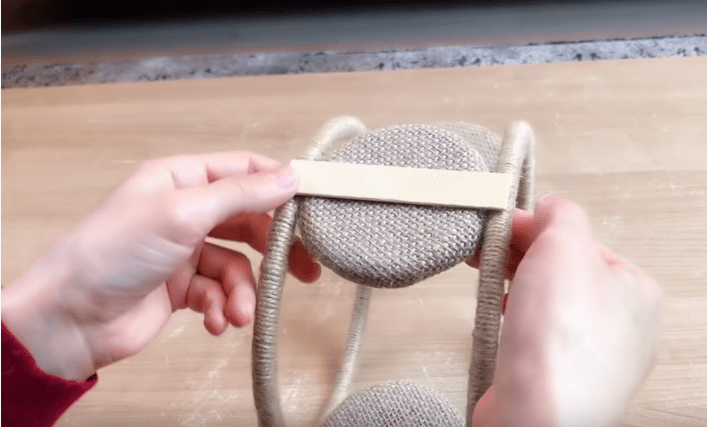 Берем пластиковое или деревянное кольцо подходящего диаметра и обматываем его джутовой веревочкой, которую фиксируем с помощью горячего клея. Аналогичным образом подготавливаем и второе кольцо.