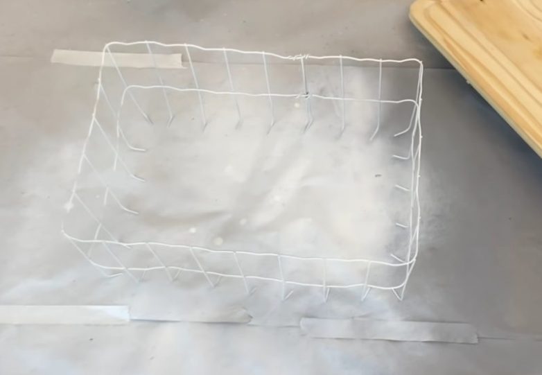 Согните сетку так, чтобы она приобрела прямоугольную форму и поместите внутрь деревянную доску. Переплетите края сетки между собой.