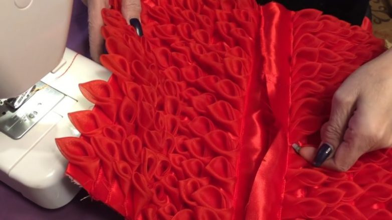 Прикладываем и к ней пристрачиваем ленту с лепесточками.