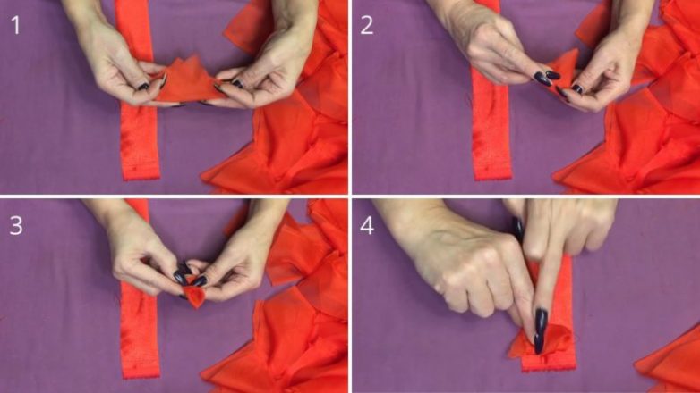 Теперь учимся складывать лепестки. Сначала квадрат складываем пополам треугольником (1), затем ещё раз пополам (2), далее оба края заворачиваем в серединку (3) и конвертом вниз прикладываем к ленте (4). Так пристрачиваем на машинке в ряд.