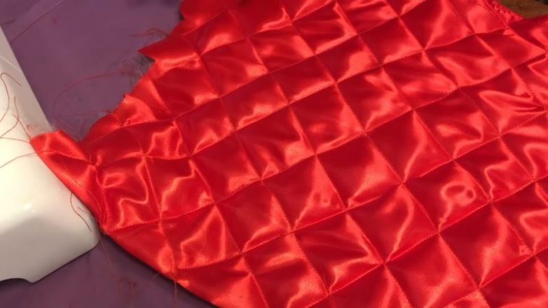 Для обратной стороны берём такую же атласную ткань, и чтобы после набивки подушка не была вся в комочках от синтепона, прошиваем её на машинке, как показано на фото ниже.