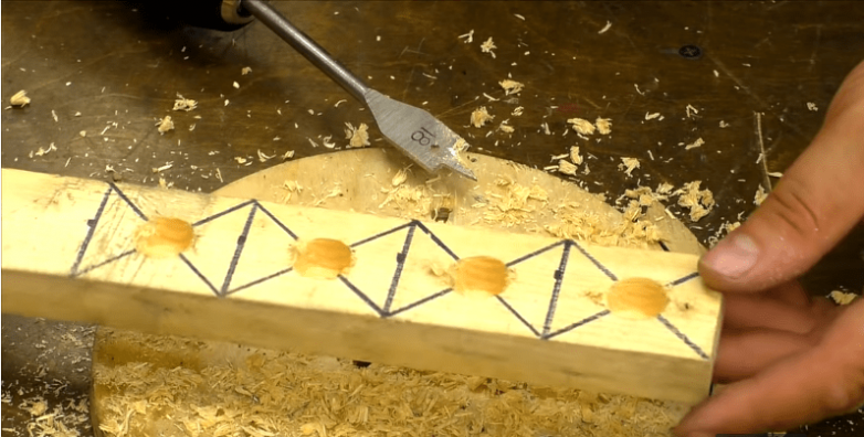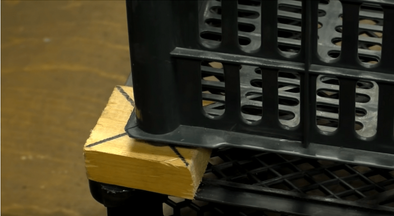 Чтобы ящики надежно стояли друг на друге, подготовим дополнительное крепление. Для этого берем не очень толстый деревянный брусок, в нашем случае с размерами 20 см на 70 см, и размечаем его на 4 отрезка по 5 см. Далее у каждого из отрезков намечаем центр и просверливаем несквозное отверстие, с диаметром немного больше, чем у ножек ящика.
