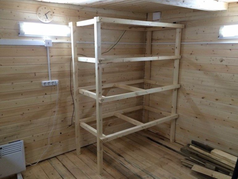 Дальше делают стенки (доски, фанера и.т.д.). Потом отмечают места, где будут полки и приступают к изготовлению.