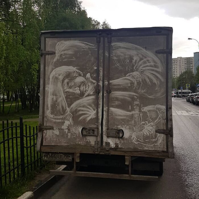 «Вандальные» работы художника настолько хороши, что машины потом элементарно жаль мыть. Созерцать подобные картины на улицах Москвы, пусть это и банальная грязь на грузовиках, одно удовольствие.