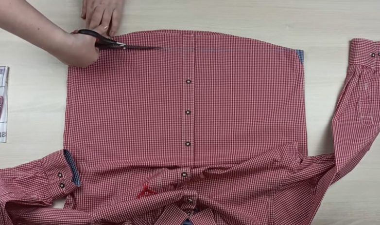 Обрежьте рубашку по ширине пакета. Срежьте карман. Отрежьте рукава, срежьте с них манжеты и разрежьте по внутреннему шву.