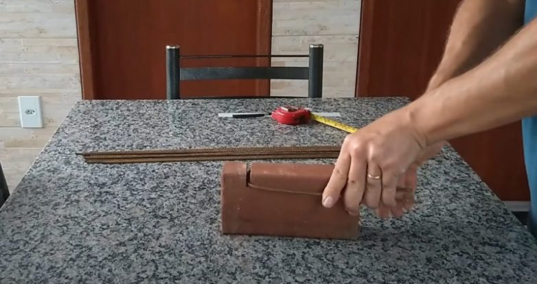 Сделайте в кирпиче прямоугольную прорезь. Поместите в эту прорезь металлический прут так, чтобы выступы с каждой стороны были одинаковы.