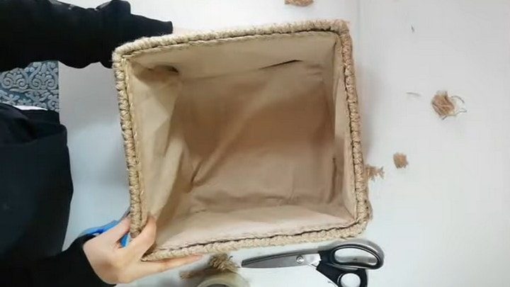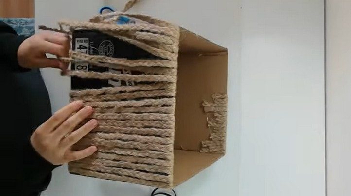 Возьмите короб, с которым будете работать, приложите к краю конец шнура и обмотайте его шпагатом по двум боковым сторонам и дну. Прибавьте немного к получившейся длине на крепление и отрежьте.