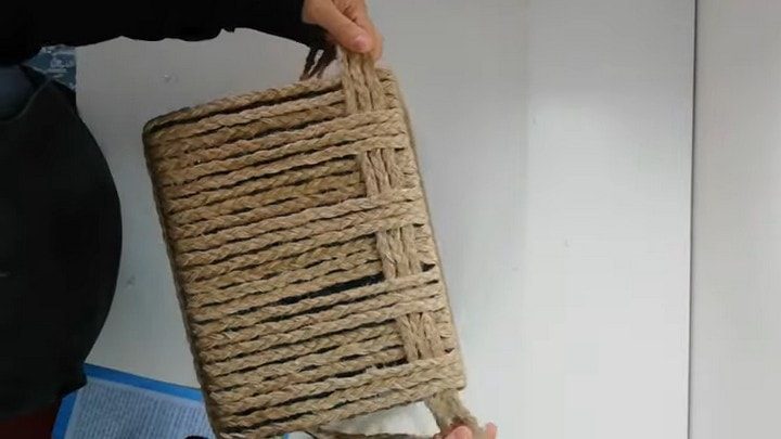 Для оставшихся незакрытыми боковых сторон нарежьте джут кусками, равными длине стороны плюс припуск на крепление. С помощью клеевого пистолета наклейте отрезки, подсовывая один конец под витки шпагата на дне, а другой — вовнутрь коробки. Их количество на каждой стороне также должно быть кратно трём. После того, как все стороны короба будут заполнены вертикальными протяжками, отмерьте кусок, равный ширине всех четырёх сторон плюс припуск на крепление. Нарежьте достаточное количество таких отрезков. Возьмите три и, начиная с одного из углов, вплетайте их в вертикальные протяжки: три поверх, три снизу.