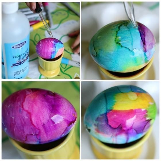 Разве не интересно наблюдать, как цвета размываются и сливаются вместе? Продолжайте капать небольшое количество спирта на яйцо, пока все цвета не смешаются.