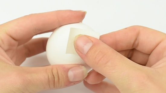 Первым делом надо сделать желаемое количество пустых яиц. Это можно сделать методом выдувания. Возьмите яйцо (оно обязательно должно быть комнатной температуры), хорошо вымойте его с мылом. Далее на 2 конца яйца наклейте кусочек бумажного скотча, что бы яйцо при прокалывании не трескалось.