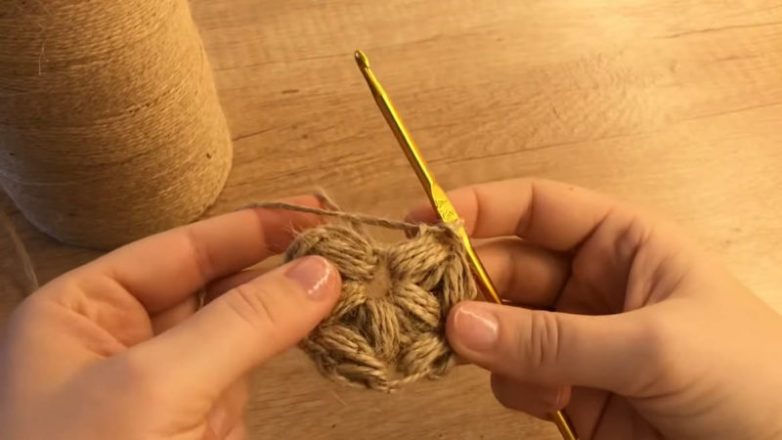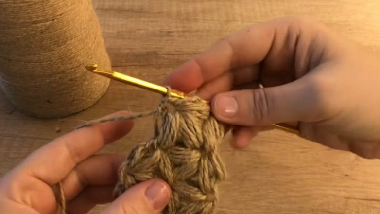 Четвертый ряд: как обычно, поднятие на воздушную петлю + пышный столбик. Дальнейшая схема вязания такая: 3 + 3 + 3 + 2. В пятом ряду: 3 + 3 + 3 +3 + 2, и так далее, пока размер салфетки не будет вас устраивать. Затем спрячьте нити в вязание и используйте красивую джутовую салфетку по назначению!
