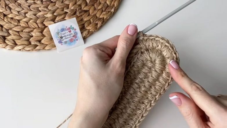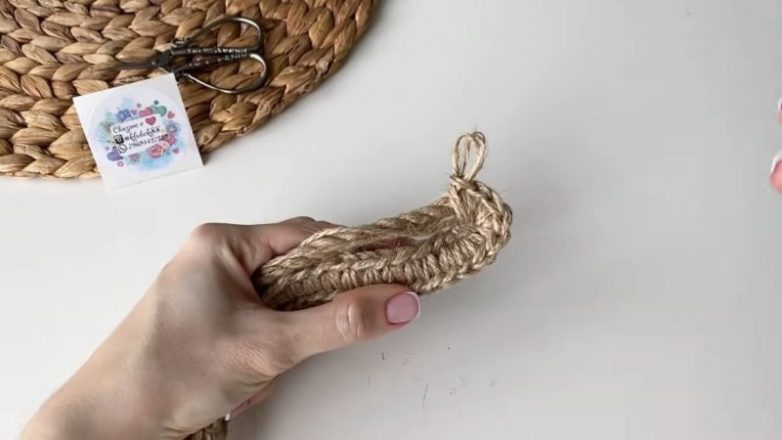 В конце, в 19 петлю, провязать два раза, а в 20 — пять раз с резким поворотом каната, чтобы затем повернуть всё вязание и получить в итоге идеальный овал. Чем толще/тоньше ваш канат, тем больше/меньше дополнительных петель нужно делать в конце рядов на повороте вязания.