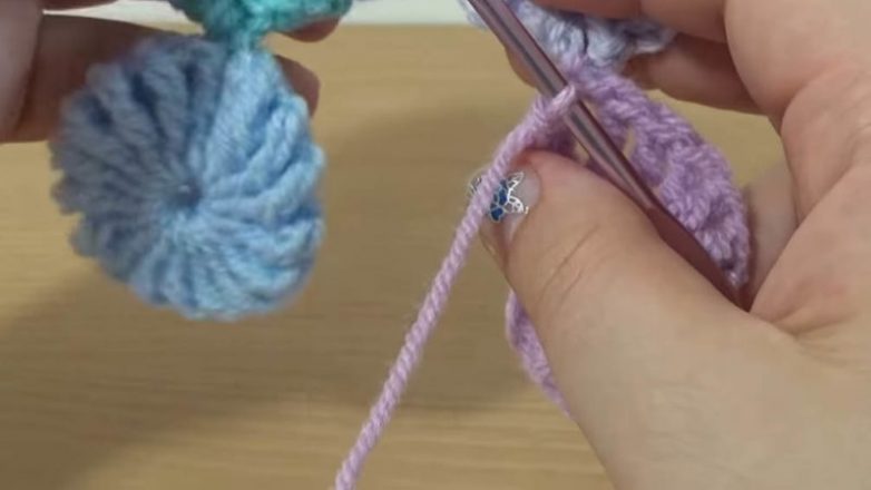 Затем постепенно вытягиваем пряжу через каждые две петли на крючке, пока не вытянем все.