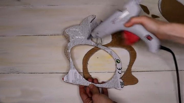 Если у вас есть ненужная фанера и электролобзик, то силуэт кролика лучше вырезать из дерева. Если этих материалов нет, сгодится и обычный картон от упаковочного материала. Обведите силуэт (ссылка на шаблон есть под видео) и вырежьте при помощи канцелярского ножа. Вырезайте аккуратно — яйцо из середины тоже понадобится. Для большей прочности вам понадобится как минимум по две детали кролика и яйца, которые нужно склеить между собой.