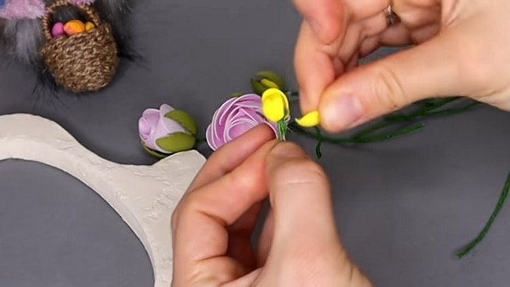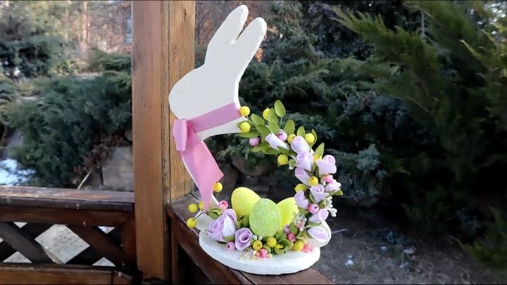 Цветы, веточки и сахарные ягодки приклейте к самой подставке, а также на спинку кролику. Композицию прекрасно дополнят цветные пенопластовые яйца и розовый бантик на шее ушастого.