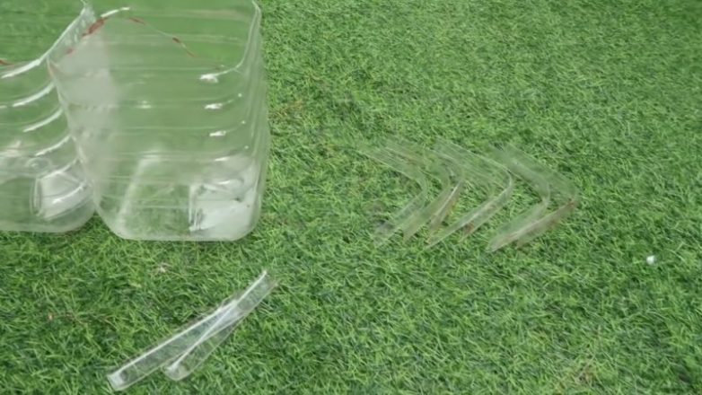 На 5-литровых бутылках наметьте с двух параллельных сторон крышу, обрежьте.