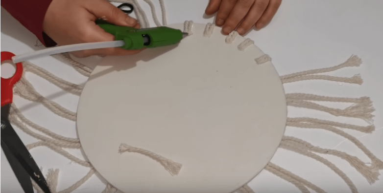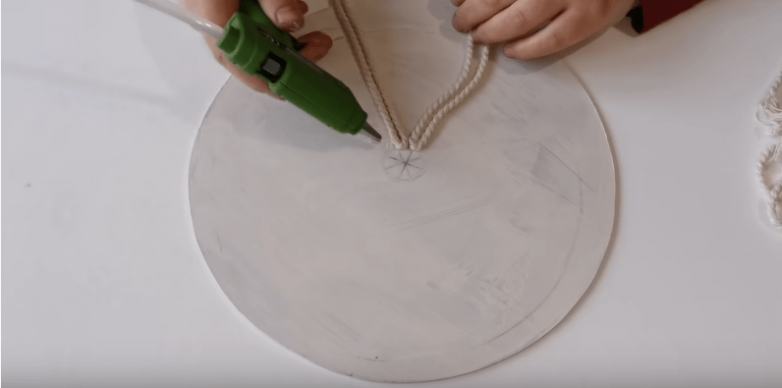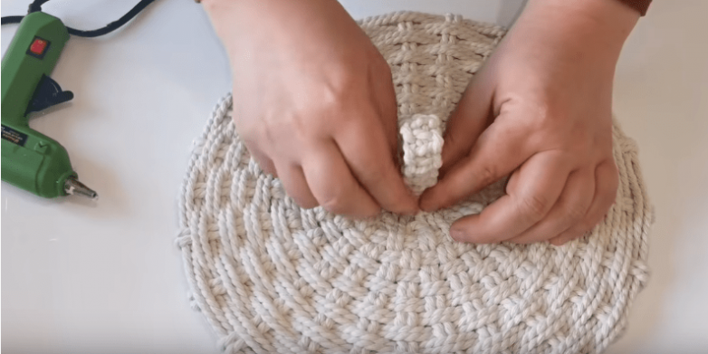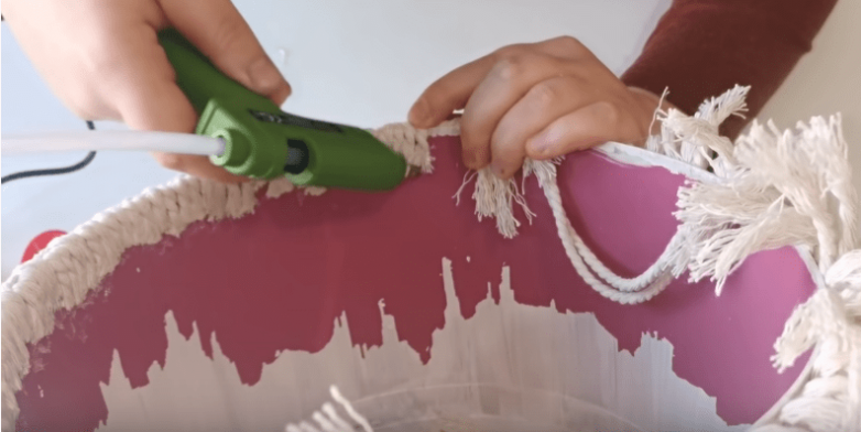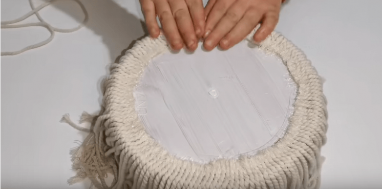 А затем переходим и к самому плетению. Берем дополнительный канат, горизонтально приклеиваем его к крышке, маскируя под какой-либо вертикальный канат, и друг за другом оплетаем столбики в шахматном порядке.