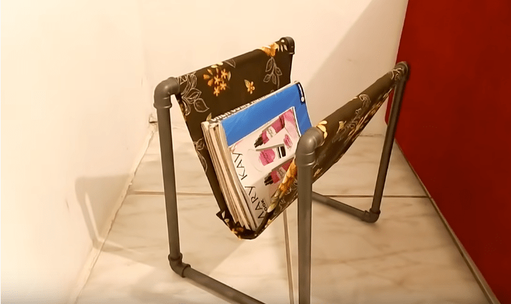 Сделайте из пластиковой трубы вот такой гамак-полку для журналов и книг. Кстати такой предмет интерьера по достоинству сможет оценить и ваш кот, ведь это прекрасная уютная лежанка подойдет и ему, правда может понадобиться слегка скорректировать параметры.