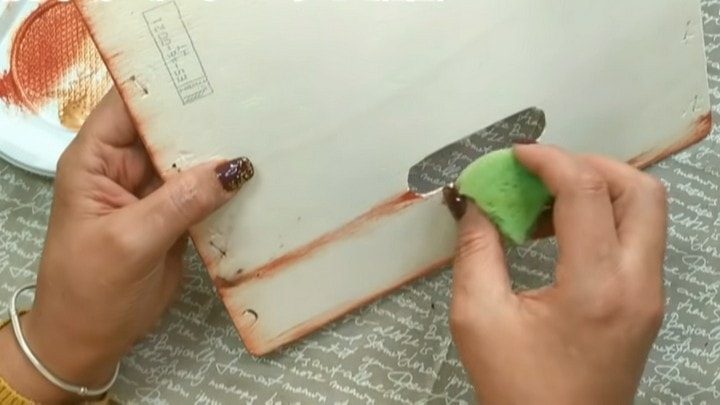 На кусочек обычной хозяйственной губки наберите небольшое количество коричнево-терракотовой акриловой краски (оттенок вы можете сделать сами). Очень лёгкими движениями «испачкайте» краской фанеру по краям, а также проведите линии по продавленным бороздкам.