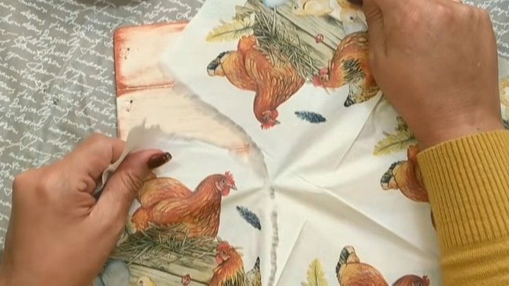 Подберите салфетку с понравившимся вам мотивом. С деревяшками, которые мы пытаемся изобразить, отлично будет смотреться деревенское куриное семейство. Желательно не вырезать требующуюся часть салфетки ножницами, а аккуратно вырвать её или, как в этом случае, сначала обвести область кистью, смоченной водой, а затем отделить нужное.