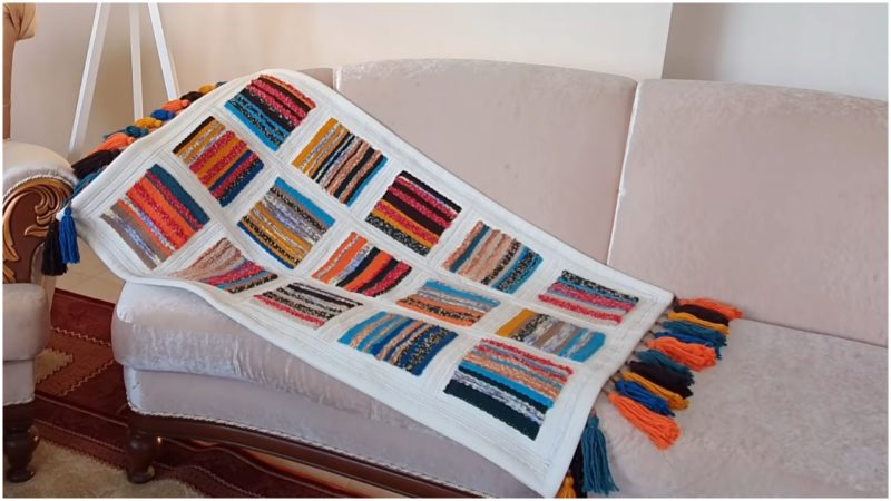 Подробный процесс создания пледа из остатков пряжи можно посмотреть на видео: