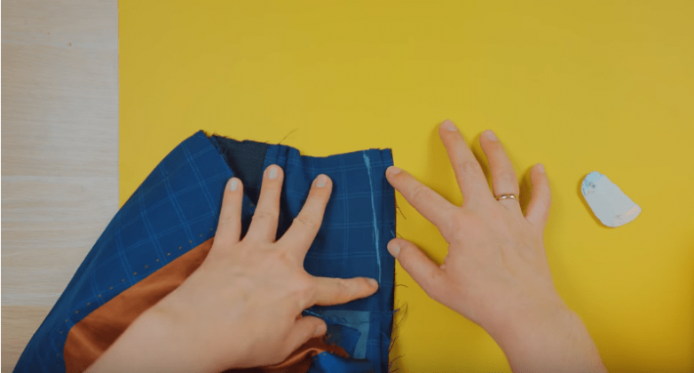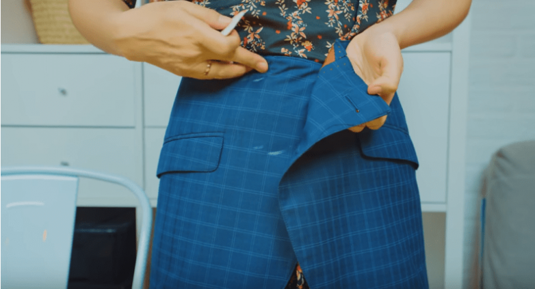 Так как будущую юбку нужно все-таки подогнать по талии, по исходным швам пиджака делаем выточки, уменьшая талию до необходимого размера. Верхний срез юбки обрабатываем также как и срез пиджака — подгибаем края внутрь и прошиваем.