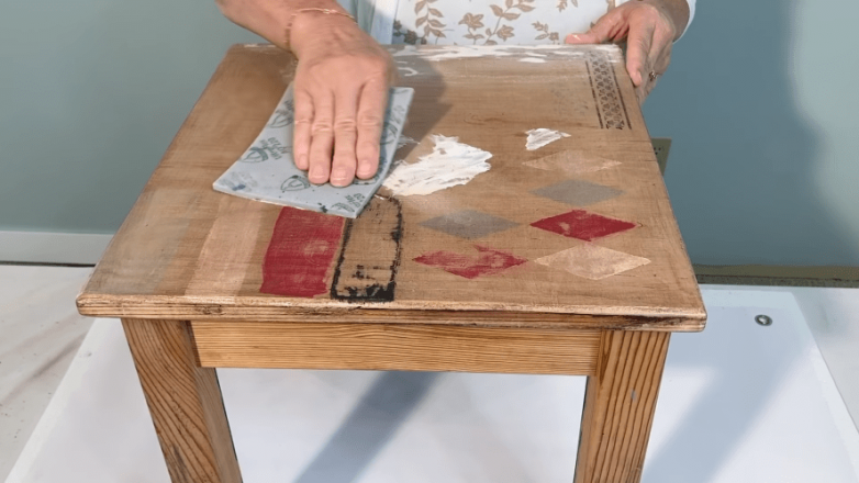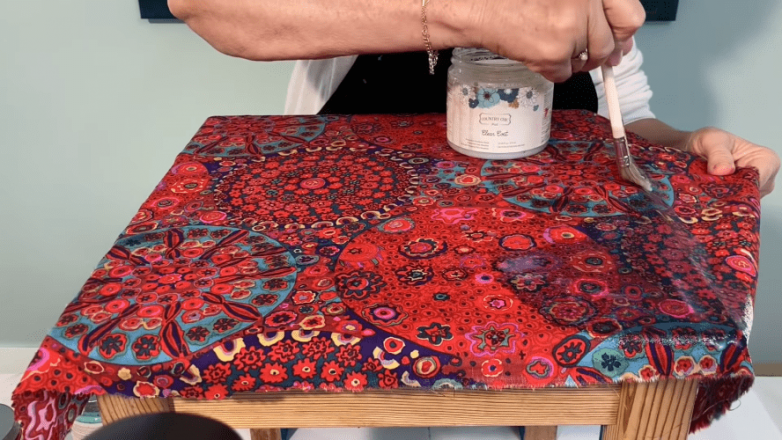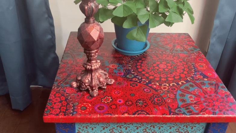 Теперь на полностью высохшую поверхность нужно нанести лаковое покрытие в 2-3 слоя. В этом проекте торцы столешницы было решено оставить открытыми. При желании их также можно было приклеить по принципу декупажа, не прибегая к обрезке ткани, а просто сделав подрезы в углах. Мастерица поступила иначе — добавила к красному цвету немного патины. На окрашенные ножки и каркасную основу нанесен трафаретный рисунок.