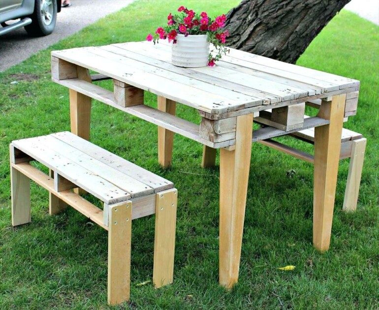 Процедура создания стола достаточно простая и потребуется совсем немного материалов. Из поддонов с легкостью можно собрать прочную кровать, диван, стулья, столы, даже беседки и скамейки для садика на даче. Для того, чтобы сделать большой и удобный стол для дачной беседки, чтобы за ним поместилась вся семья, потребуется следующее: