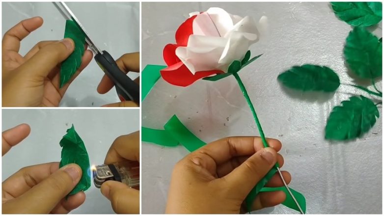 Теперь нужно дополнить розу чашелистиком и листочками. Для формирования чашелистика 3 раза складываем на угол квадрат 5 х 5 см, а затем вырезаем из заготовки каплю, расправляем и нанизываем на стебель. Для каждого листочка вырезаем прямоугольник 4,5 х 6,5 см, сгибаем вдоль и обрезаем края, чтобы сделать лист максимально похожим на настоящий. Чтобы задать объем, дополнительно обрабатываем место сгиба при помощи зажигалки. Так же при помощи заломов делаем прожилки. Обвиваем нарезанным в ленты целлофаном тонкую проволоку, а затем приклеиваем к ней листочки. Соединив листочки по 3 приматываем их к стеблю, выдерживая расстояние, как у настоящих роз. Дальше остается лишь окончательно расправить получившуюся розу и перейти к формированию следующей.