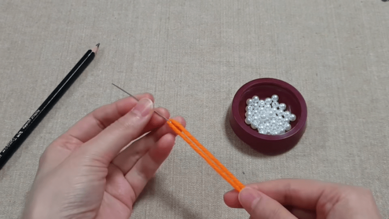 Заправляем пряжу в иголку, и нанизываем бусины так, чтобы длина жемчужной нити была немногим меньше карандаша.