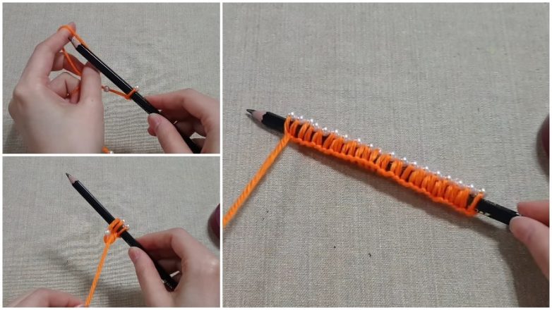 Не обрывая нити, подтягиваем следующую бусину к карандашу, затем накидываем на него петлю и затягиваем. На вновь сделанной петле также оказывается бусина. Прежде чем затянуть петлю окончательно, подтягиваем бусину к уже имеющейся. Так продолжаем до тех пор, пока все жемчужинки не выстроятся в ряд.