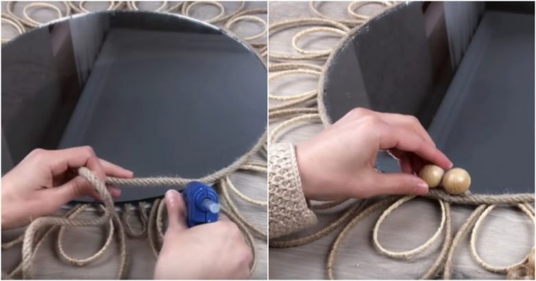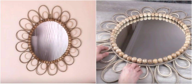 Также с помощью джутового каната маскируем край и с «лицевой» стороны зеркала. Наконец финальный штрих — декор — в нашем случае это вот такие крупные деревянные бусины. Вот и все, ваше скучное старое зеркало превратилось в по-настоящему оригинальный элемент декора!
