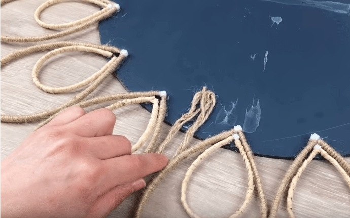 На этом этапе не забываем также приклеить сзади петлю-подвес. Сформировать ее можно из того же джутового каната.