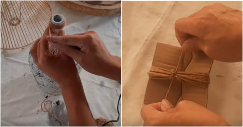 Добавляем финальный декор: в нашем случае это оплетка горлышка джутовой нитью, а также «ожерелье» с кисточками.