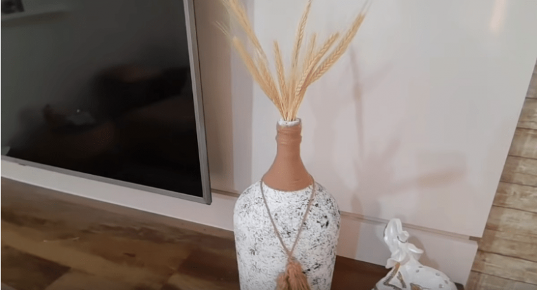 Покрываем бутылку получившимся составом в 2 слоя. Если вы хотите создать эффект шероховатости с комочками — нанесите второй слой на лишь слегка подсохший первый, если нет — перед нанесением второго слоя дождитесь полного высыхания первого.