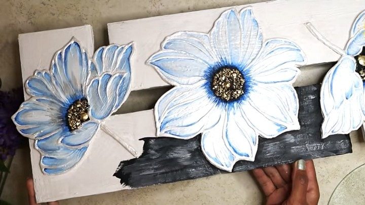 Расписываем цветы акриловыми красками. Более тёмными делаем контуры лепестков и серединки. Панно будет выглядеть ещё более эффектным, если использовать белый перламутровый акрил, а также, если промазать камушки в центре клеем, а затем прижать к ним лист золотой потали.