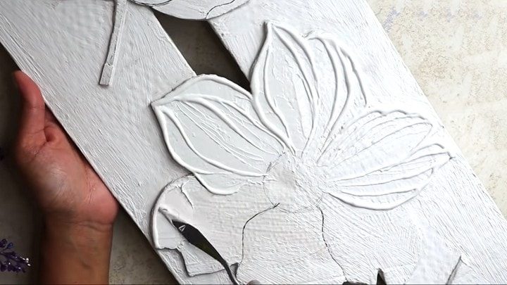 С помощью копирки переносим на подсохшую поверхность контуры цветочных лепестков. На плоской поверхности смешиваем белый акриловый художественный грунт и небольшое количество гипса. Должна получиться текстурирующая паста (можно использовать готовую). С помощью мастихина наносим смесь на лепестки, придавая им объём и текстуру.