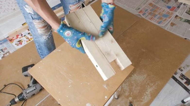 Из тех же брусков строим основание. Присоединяем планку по середине корпуса с помощью клея ПВА для дерева и саморезов, а также дополнительно укрепляем уголками.