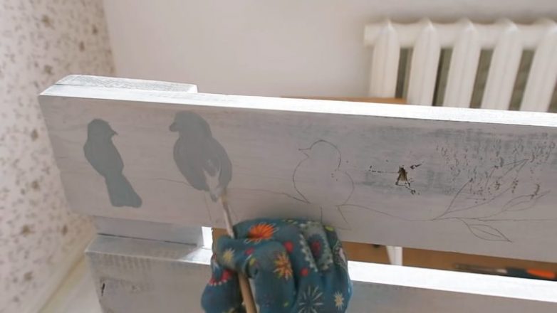 Кровать красится. Можно сначала нанести краску одного цвета, а поверх — белую, чтобы сделать интересные цветовые переходы. Можно даже нарисовать красивый и простой узор краской. После высыхания краски, следует нанести лак.