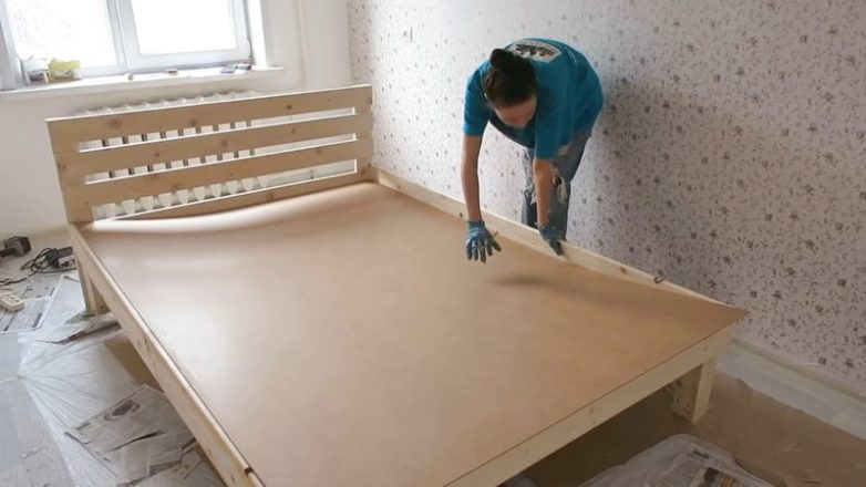 Далее, устанавливаются и закрепляются основные перекладины, которые будут держать матрас. Укладывается щит на основание. Лишняя длина обрезается.
