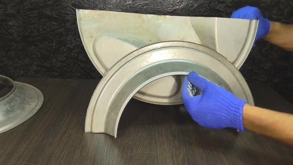 Для того чтобы наша ножка плотно примыкала к основанию барабана, его края нужно немного загнуть молотком. Для ножек мы используем половинки горловины, их крепим с обеих сторон тыльной части барабана, используя вышеперечисленные способы соединения.