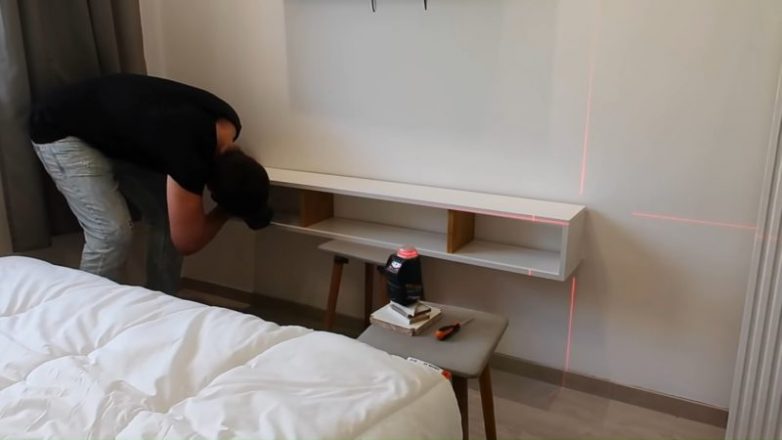 Намечаем и закрепляем узкую полку на стене.